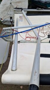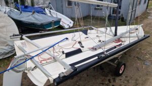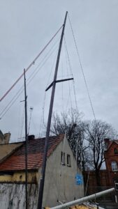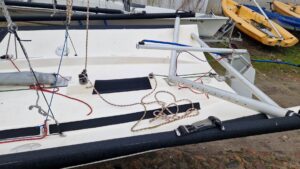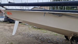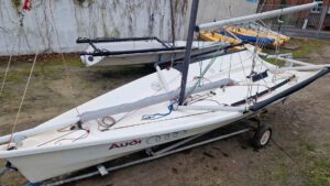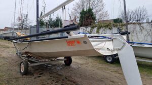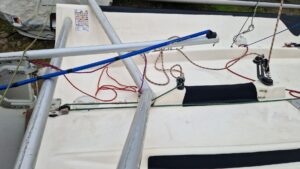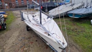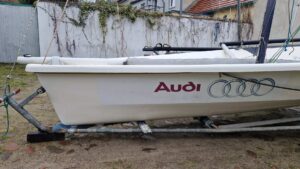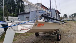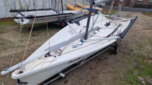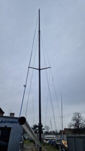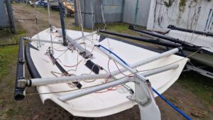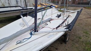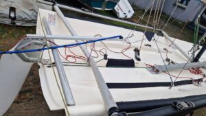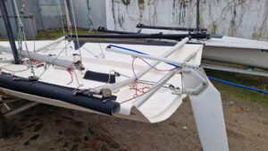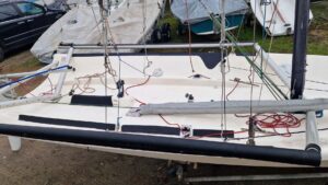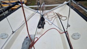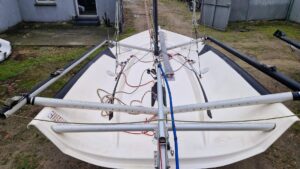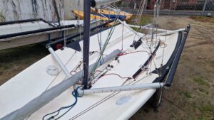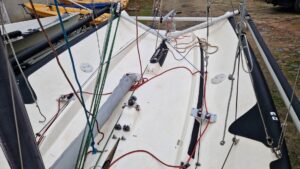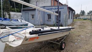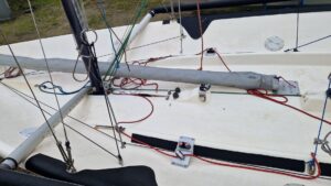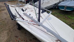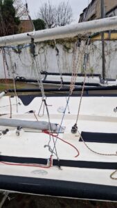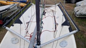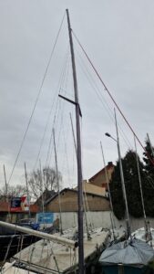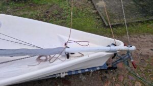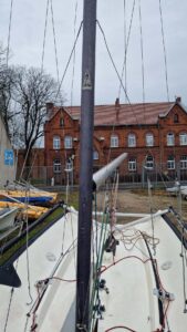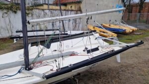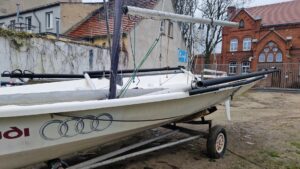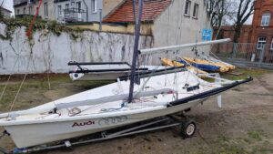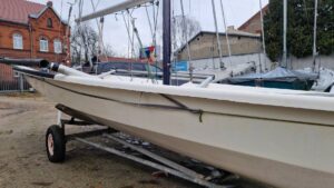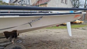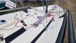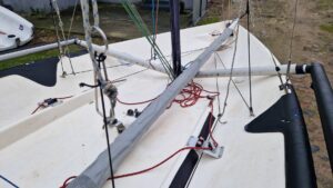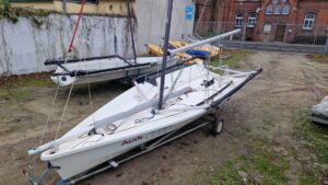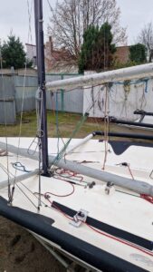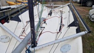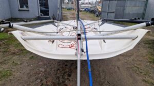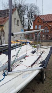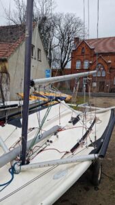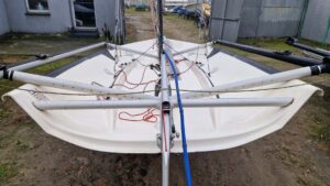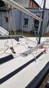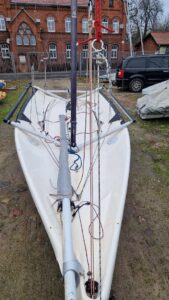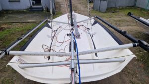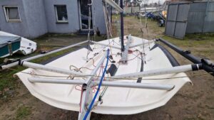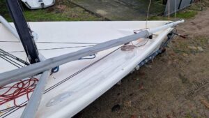 W komplecie grot, fok oraz genaker. Powierzchnia żagli 21,1m2 plus 30m2 genaker. Grot i fok w bardzo dobrym stanie. W komplecie 2 genakery jednak obydwa z dużymi dziurami – zniszczone przez myszy.