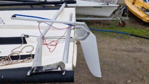 Długość 5,00m, szerokość regulowana dzięki skrzydłom balastowym 1,9m-3,05m.