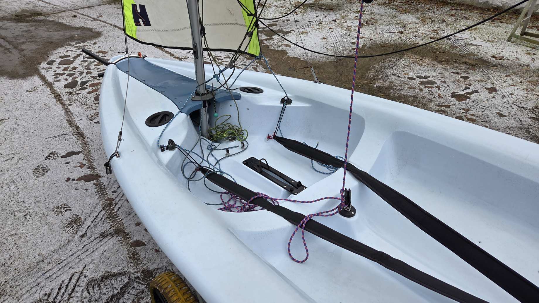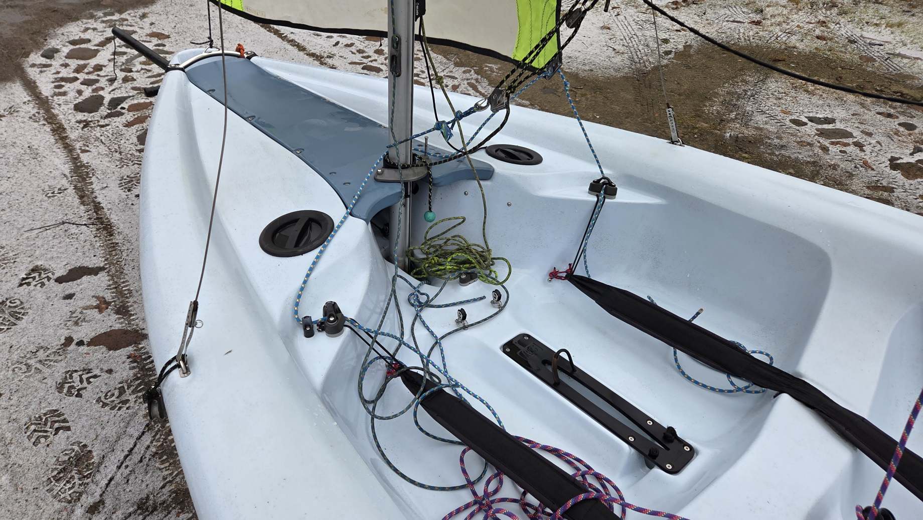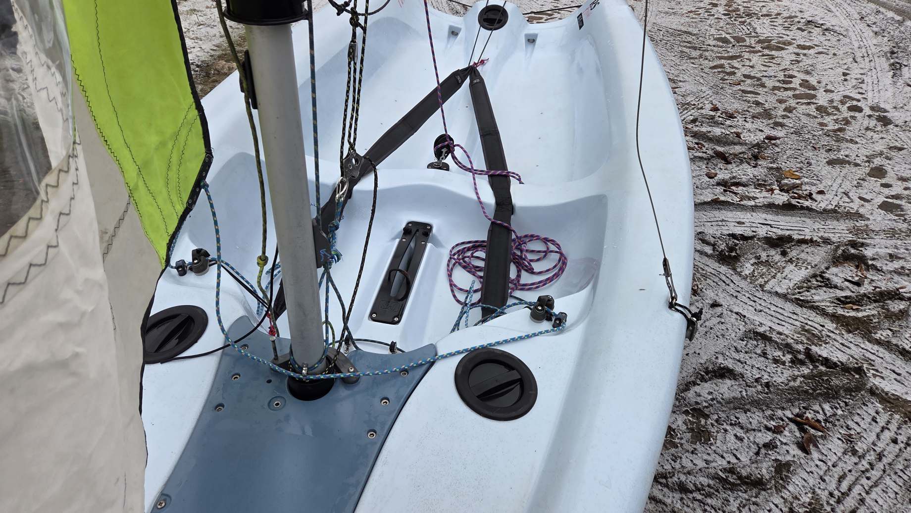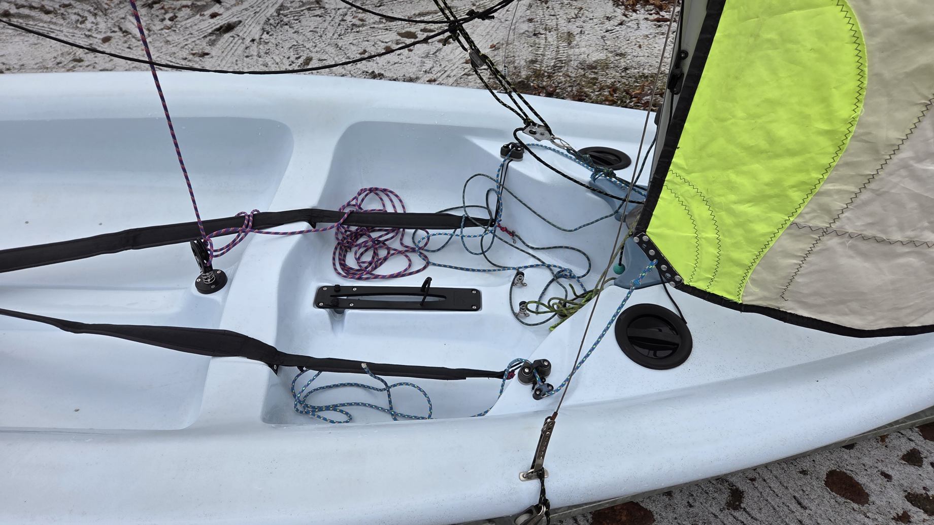 W komplecie dakronowy grot (5,5m2) + fok (2,1m2) oraz genaker (7m2). Możliwość zakupu z grotem mylarowym.