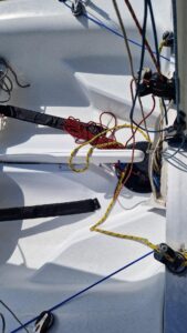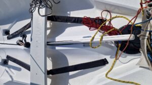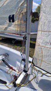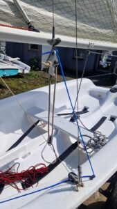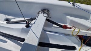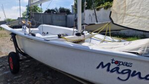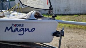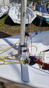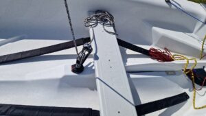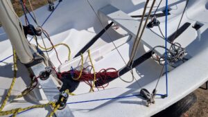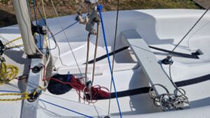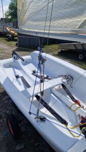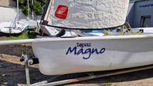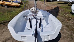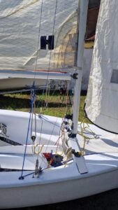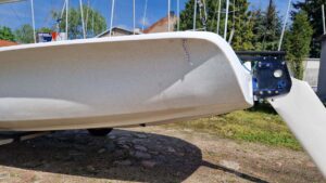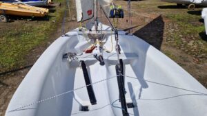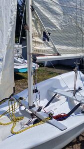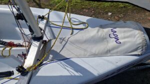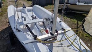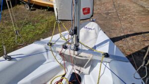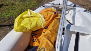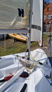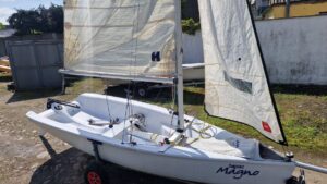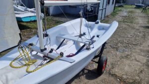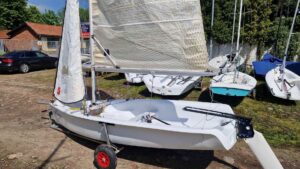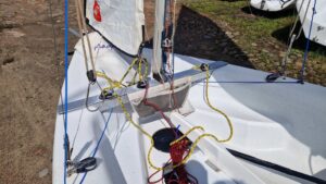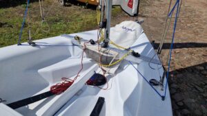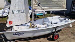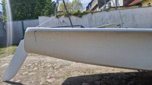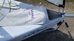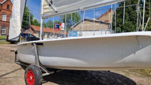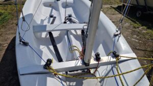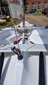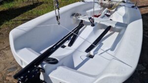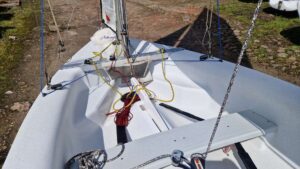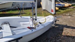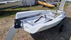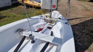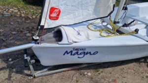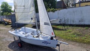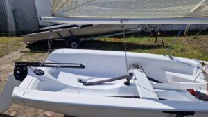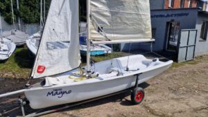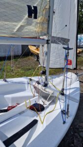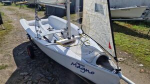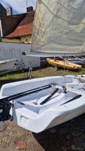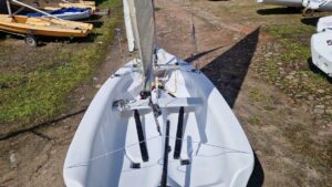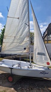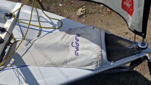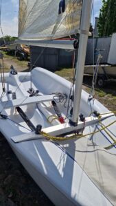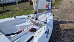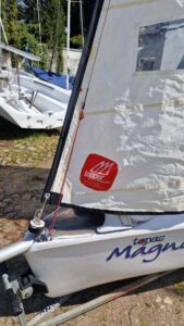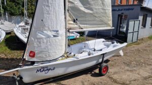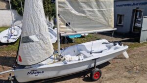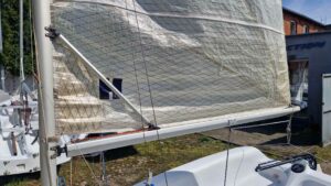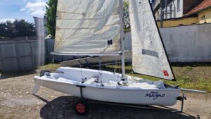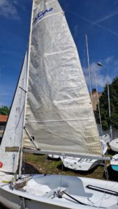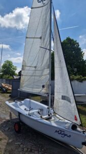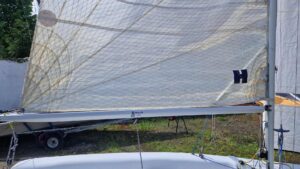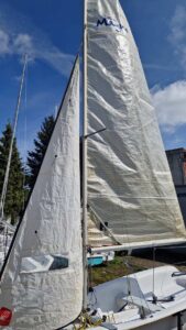 W komplecie mylarowy grot (8,12m2), dakronowy fok (2,30m2) oraz genaker. Żagle w bardzo dobrym stanie.